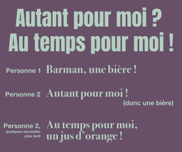 C’est ainsi que l’expression “au temps pour moi” est née. Elle est utilisée pour admettre son erreur et signifier qu’on va reprendre le problème à son origine et reconsidérer la solution. C’est une manière élégante et humble d’admettre son tort.