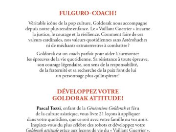 Véritable icône de la pop culture, Goldorak nous accompagne depuis notre plus tendre enfance. Le « Vaillant Guerrier » incarne la justice, le courage et la résilience. Comment faire de ces valeurs cardinales, nos valeurs quotidiennes sans Astérohaches ni de méchants extraterrestres à combattre ?
